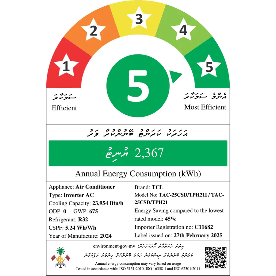 The TCL Breeze IN 24000 BTU inverter air conditioner brings premium smart cooling to your home. This state-of-the-art unit combines powerful 24000 BTU cooling capacity with intelligent inverter technology, making it ideal for large rooms between 30-50 m². Control everything from your smartphone—no dongle needed—and adjust temperature and fan settings on the fly. Built for the Maldivian climate, this AC delivers exceptional energy efficiency with a 5-star rating and uses eco-friendly R32 refrigerant. The unit operates whisper-quiet at just 46-52 dB indoors, ensuring comfort without noise disruption. With a robust 1-year warranty plus 5-year compressor protection, you're investing in durability and peace of mind. Installation covers basic setup; additional services like pipe extension, casing, or electrical work are available at extra cost. Our team can survey your space and provide a detailed quote before work begins, ensuring a hassle-free installation.