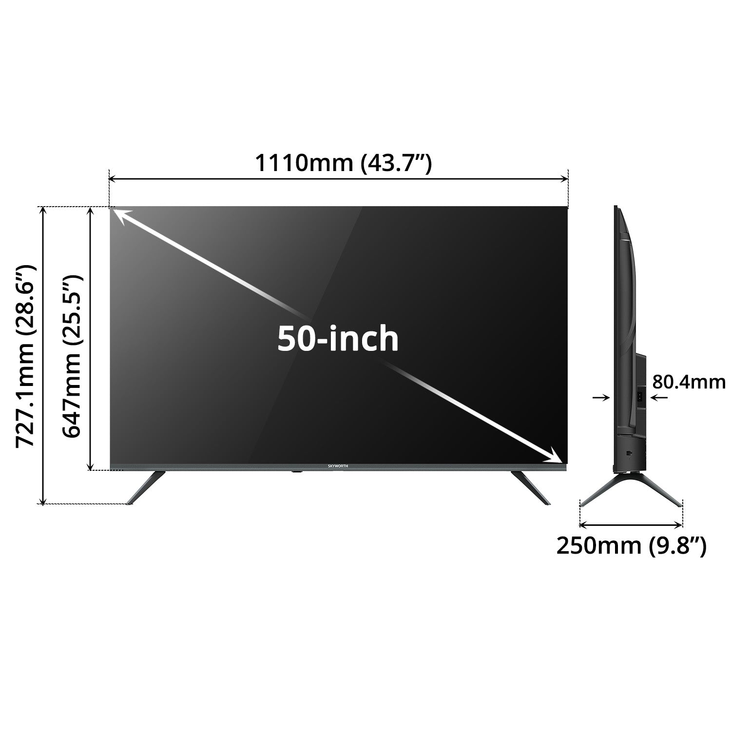 Product Dimension with Stand (W x D x H): 1110 x 250 x 727.1mm (43.7” x 9.8” x 28.6”)
