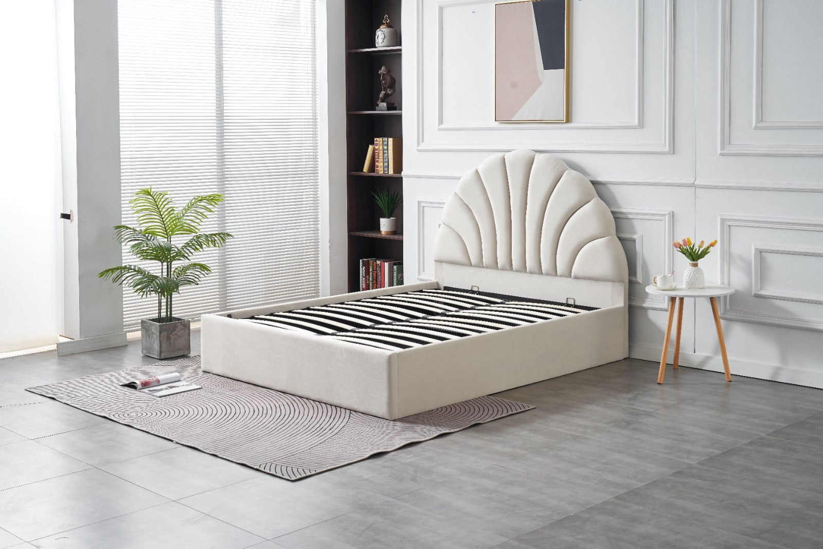 The RIFA Lunar White Storage Bed is a lift-up storage bed designed for bedrooms that need both sleeping space and practical under-bed storage. It features a softly upholstered headboard with a curved panel design and a concealed storage compartment beneath the mattress base.